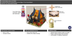 Annotate layout that clarifies room functions, key items that support worldbuilding and player interaction with NPC